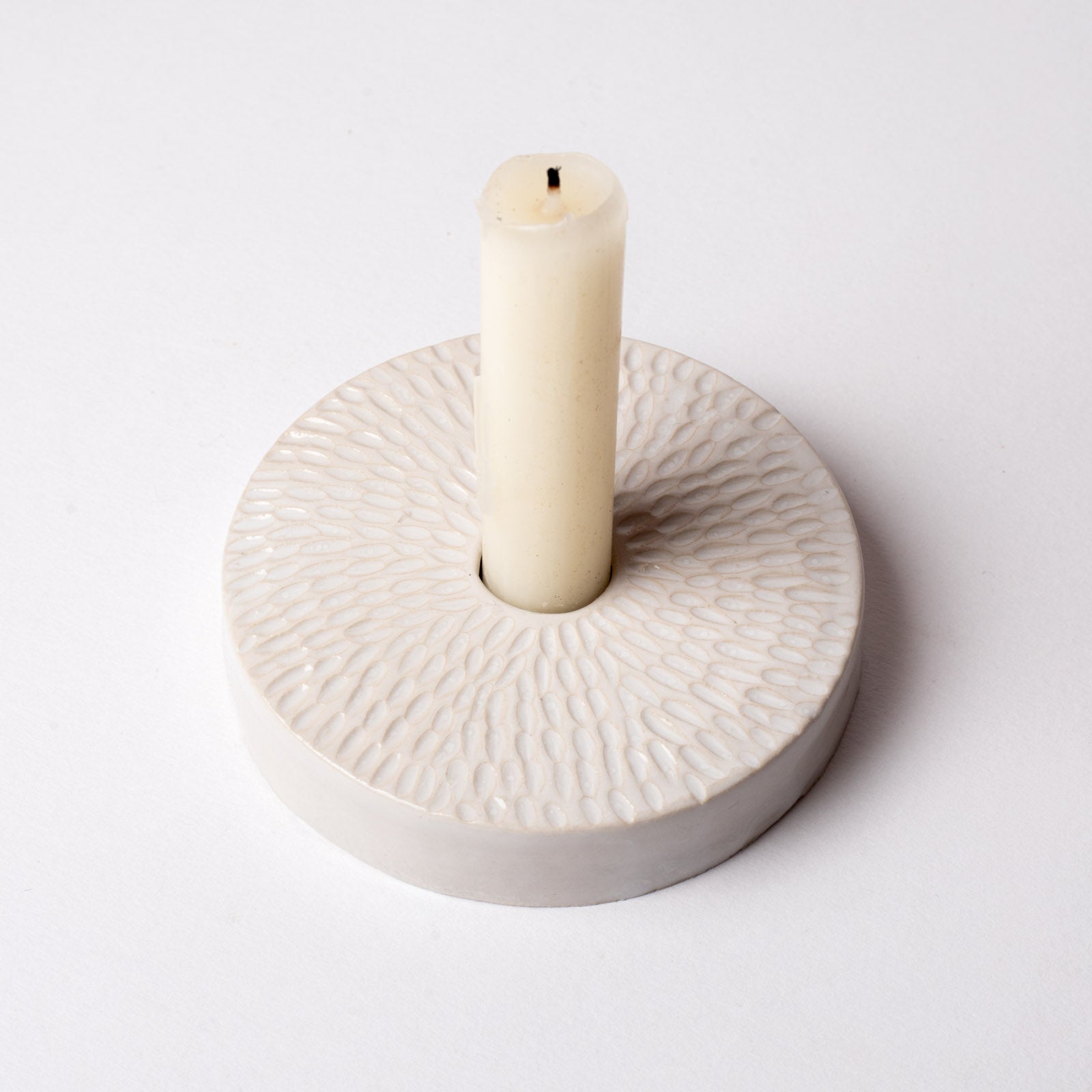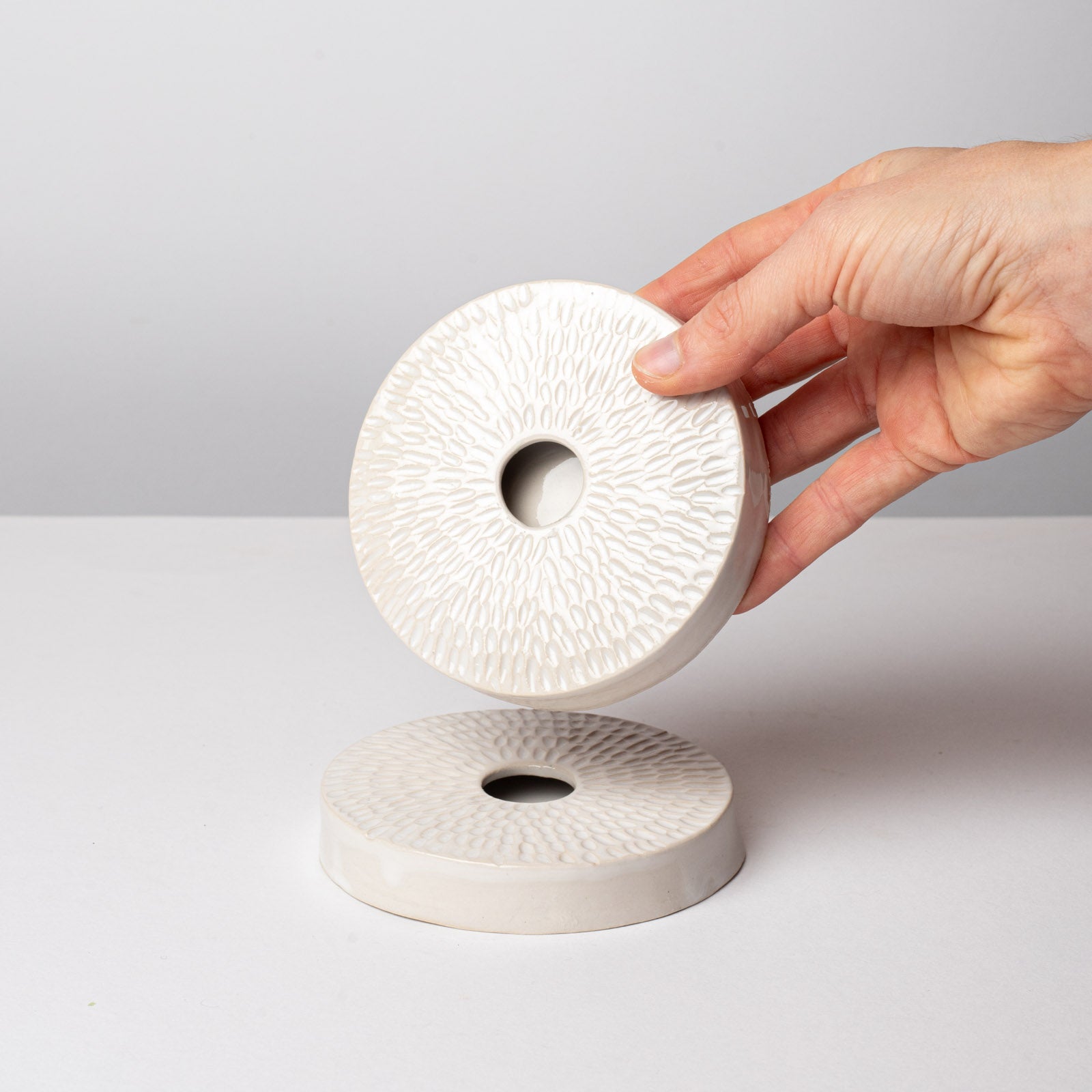 Un duo de bougeoirs texturés en grès blanc brillant. Il peut également se détourner en petit soliflore pour y mettre une fleur fraiche et un peu d'eau.