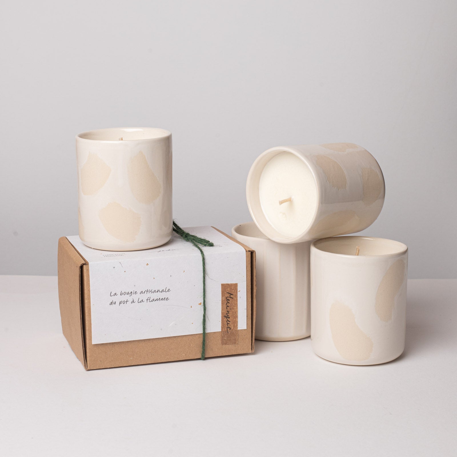 Une bougie blanche avec des effets de matière qui laisse apparaître le grès brut. Le petit plus, elle se transforme en petite tasse une fois consumée !